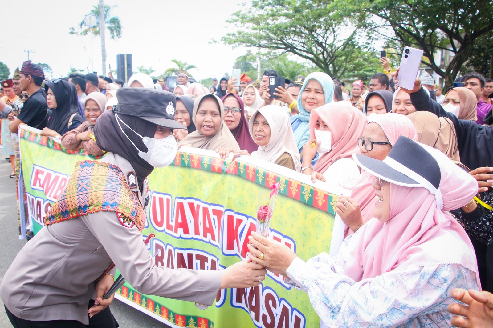 Ratusan massa yang datang menyuarakan aspirasi terkait pengakuan hak ulayat serta penolakan kriminalisasi tokoh adat, disambut dengan cara yang tidak biasa. Aparat kepolisian menyapa para demonstran dengan mengenakan tanjak dan selendang, simbol adat Melayu, sekaligus menyerahkan bunga sebagai bentuk penghormatan dan persaudaraan.