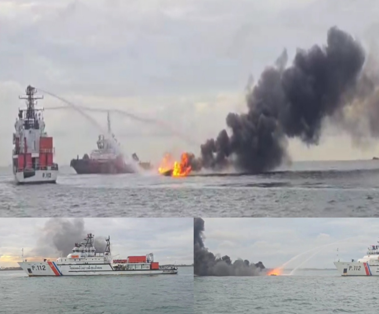 Sementara itu, KN Sarotama P.112 dikomandoi langsung oleh Capt. Nico Morris S, A.Md, M.Mar, yang dengan sigap mengoordinasikan tim untuk memadamkan api dan mengamankan area sekitar.