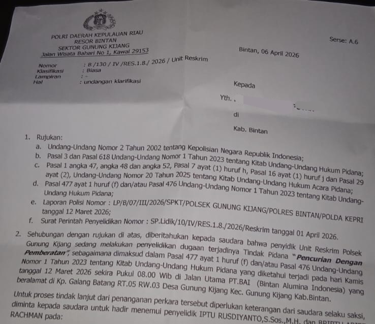 Dalam rangka penyelidikan, Unit Reskrim Polsek Gunung Kijang kemudian melayangkan undangan klarifikasi kepada sejumlah pihak yang dianggap mengetahui peristiwa tersebut. Salah satu pemanggilan tercatat pada 08 April 2026, sebagai bagian dari upaya pengumpulan keterangan.