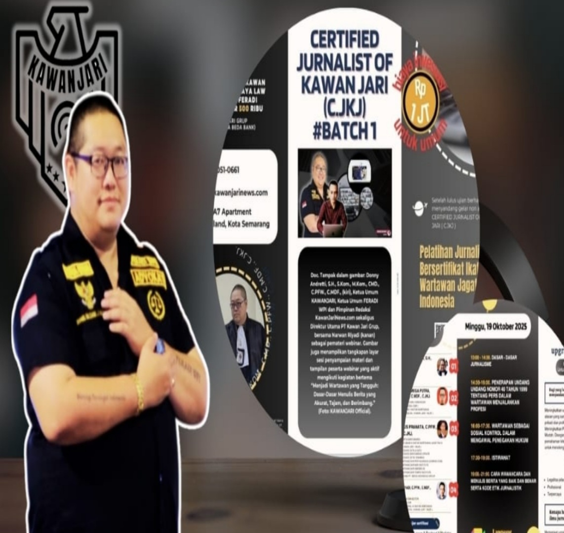 TINTAJURNALISNEWS —Ikatan Wartawan Jagat Raya Indonesia (IWJRI) atau Kawan Jari bersama PT Kawan Jari Grup resmi membuka Pelatihan Wartawan Bersertifikat Profesional melalui program Certified Journalist of Kawan Jari (CJKJ) Batch 1. Kegiatan ini digelar secara daring via Google Meet dan diikuti peserta dari berbagai daerah di Indonesia.