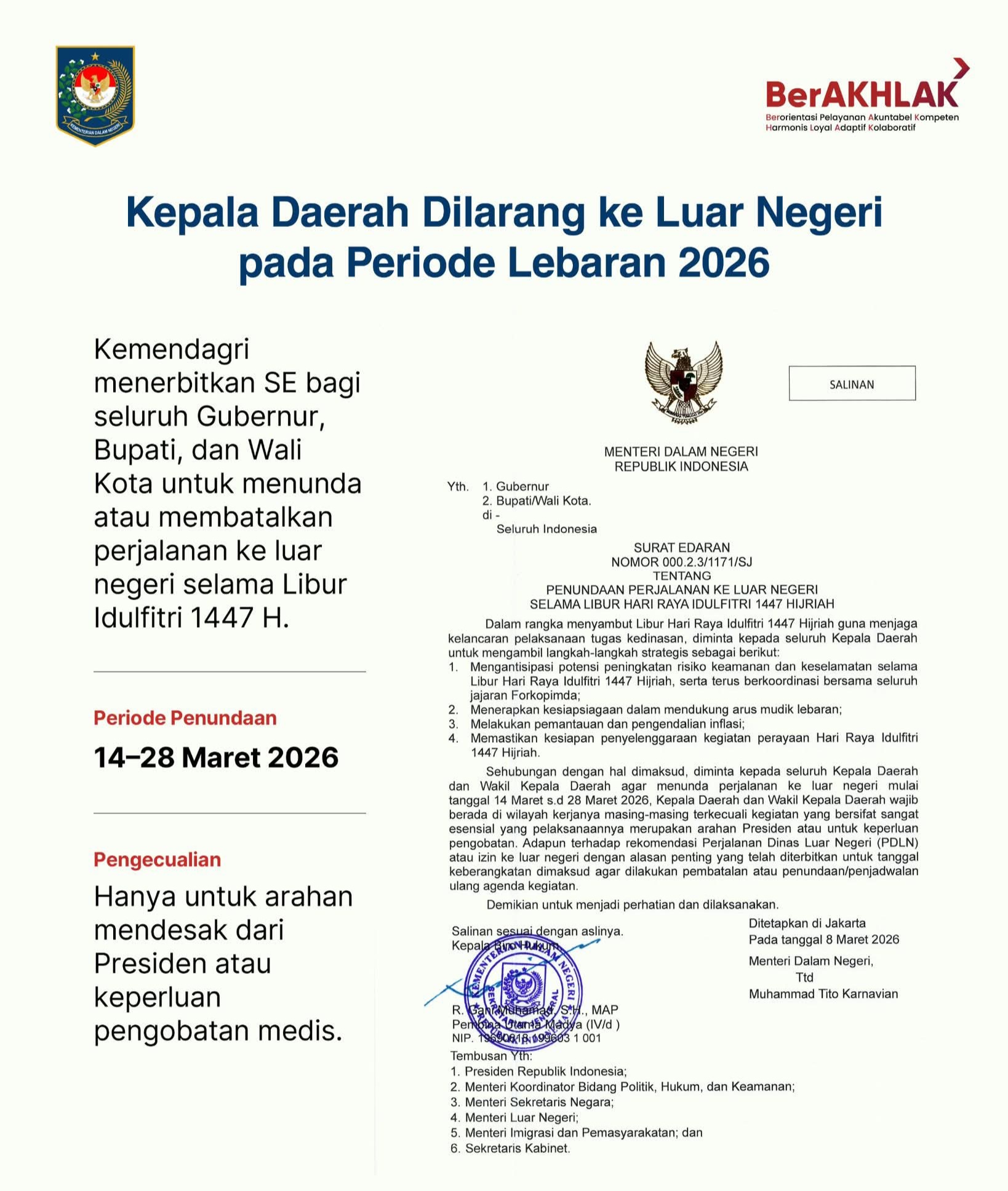 Instruksi tersebut tertuang dalam Surat Edaran Menteri Dalam Negeri Nomor 000.2.3/1171/SJ tentang Penundaan Perjalanan ke Luar Negeri Selama Hari Raya Idulfitri 1447 H.