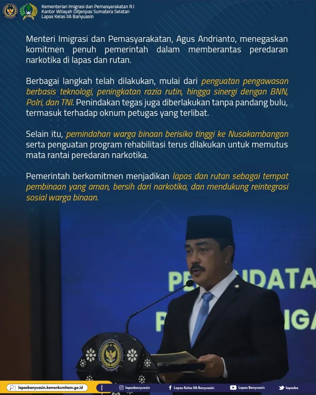 Menteri Imigrasi dan Pemasyarakatan, Agus Andrianto, menegaskan bahwa peredaran narkoba di dalam lapas merupakan pelanggaran serius yang tidak akan ditoleransi, baik yang melibatkan warga binaan maupun oknum petugas.