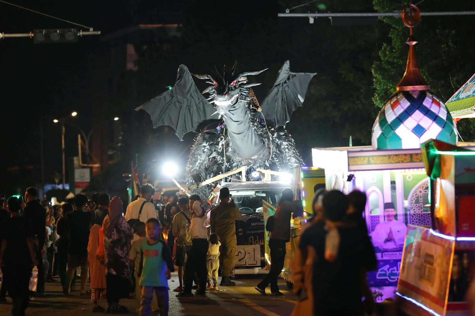 Beragam kreasi ditampilkan peserta, mulai dari replika masjid yang megah, miniatur kapal yang melambangkan perjalanan spiritual, hingga sosok naga hitam yang tampil mencolok dan atraktif. Warga tampak antusias memadati kawasan Dataran Engku Putri hingga sepanjang rute pawai, larut dalam suasana syukur menyambut Hari Raya Idulfitri 1447 Hijriah.