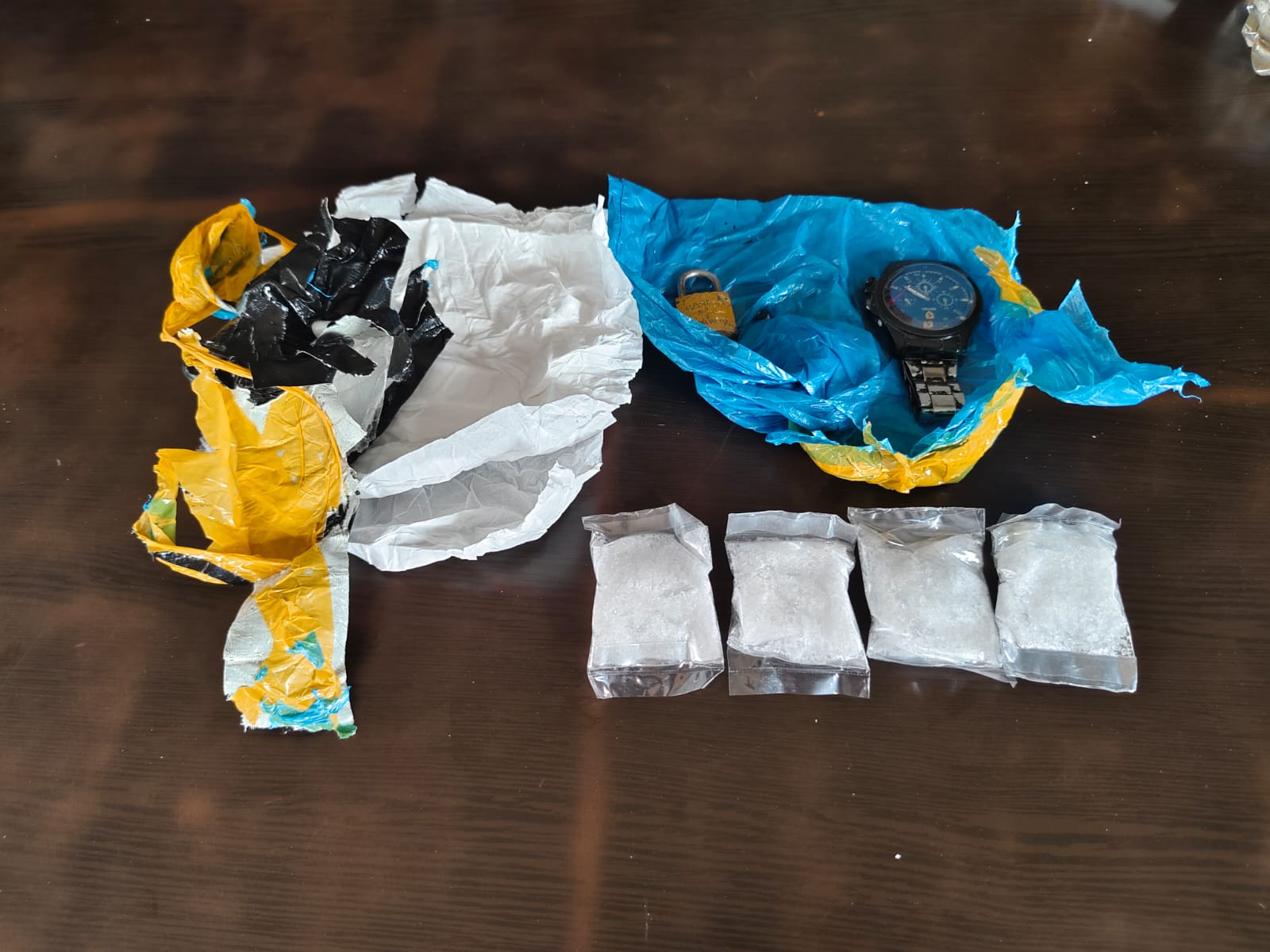Setelah diamankan, bungkusan tersebut dibawa ke ruang Kepala Jaga untuk dibuka. Hasilnya, petugas menemukan empat paket sedang berisi serbuk putih berbentuk kristal yang diduga kuat merupakan narkotika jenis sabu. Selain itu, turut ditemukan sebuah jam tangan dan gembok kecil di dalam bungkusan tersebut.