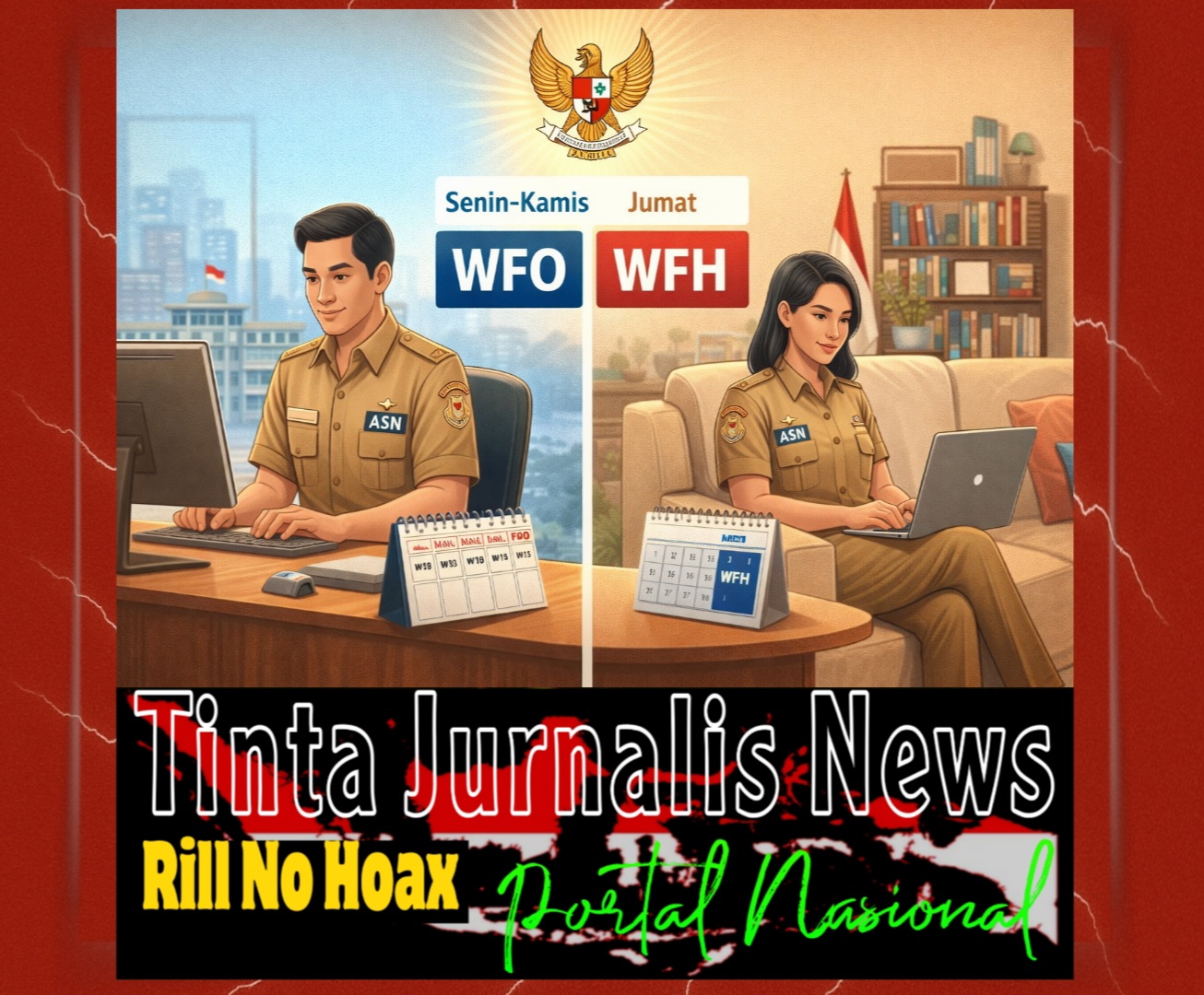 Dalam ketentuan tersebut, pola kerja ASN diatur lebih fleksibel melalui kombinasi lokasi kerja, yakni empat hari bekerja dari kantor (Work From Office/WFO) pada Senin hingga Kamis, serta satu hari bekerja dari rumah (Work From Home/WFH) setiap Jumat.