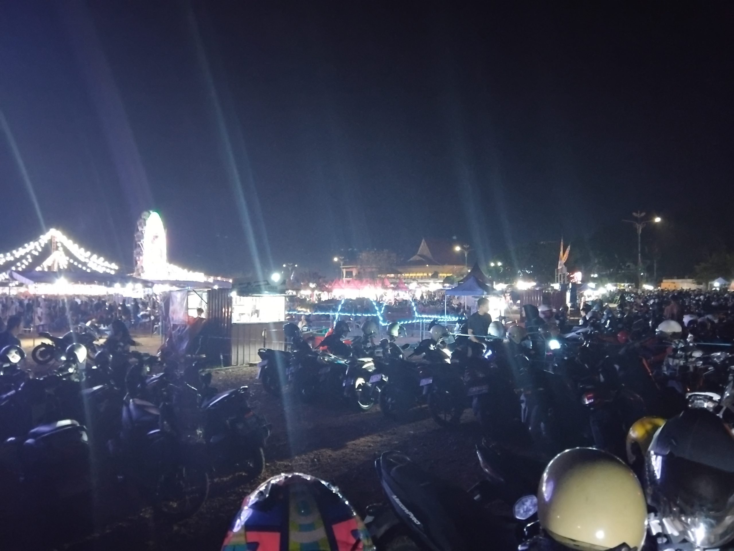 Arus pengunjung terlihat terus mengalir sepanjang malam. Salah satu titik yang menarik perhatian adalah wahana bianglala yang menyala terang dan menjadi pusat aktivitas. Cahaya lampu yang berwarna-warni menambah daya tarik kawasan, sekaligus menjadi latar bagi pengunjung yang mengabadikan momen.